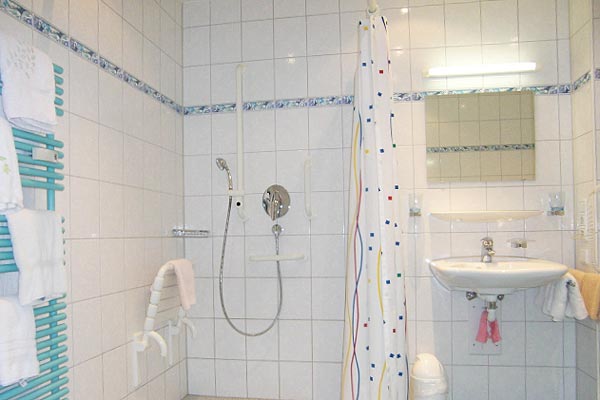 Die im EG mit eigenem Ausgang zum Garten liegende FW “Nebelhorn“ (87 qm/ 4 Pers.) ist rollstuhlgerecht, und mit sehr ansprechenden Maßmöbeln gestaltet. Als Besonderheit besitzt sie 2 Schlafzimmer (inkl. elektrischem Lattenrost), mit je einer gemütlichen Sitzecke mit Kabel-TV und wie oben beschrieben eine sehr große DU/WC absolut barrierefrei mit großem Wendekreis, allen notwendigen Griffen, Duschsitz, unterfahrbarem Waschbecken und Kippspiegel.